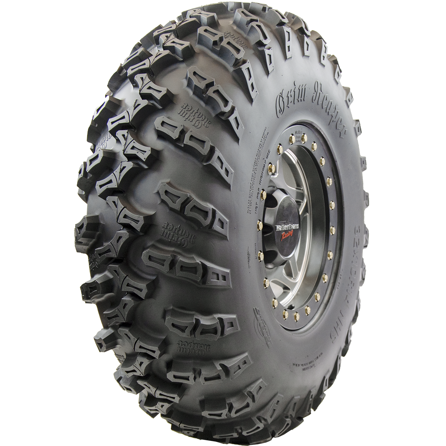 The Grim Reaper tire boasts a hauntingly powerful presence as it grips the earth with its bone-like tread. Its 8 plies of radial construction embody unwavering strength, puncture resistance, and a high load capacity. The tire's tread lugs are reminiscent of a skeletal claw, delivering unmatched grip to any terrain. Its deep lugs and open void ratio clear away the mire of mud and dirt, ensuring a persistent hold on the ground, even in the most terrifying conditions.